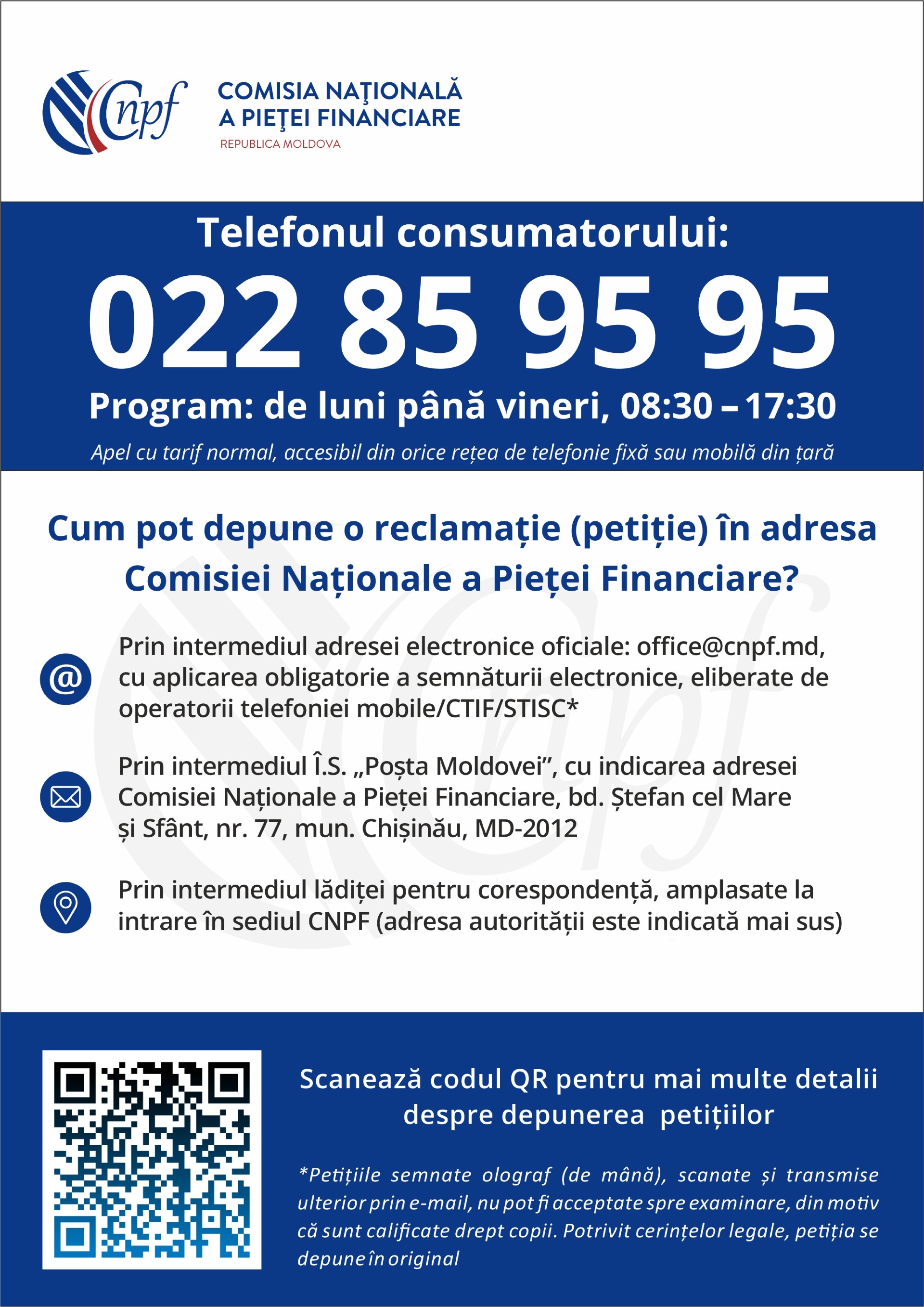 - adresa de contact - mun. Chișinău, bd. Ștefan cel Mare și Sfânt 77, www.cnpf.md,Reclamațiile pot fi depuse: prin e-mail (cu respectarea reglementărilor cu privire la forma electronică – cu aplicarea 2 semnăturii electronice) la adresa office@cnpf.md;